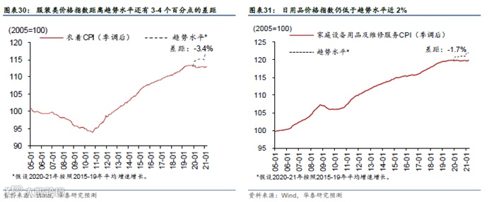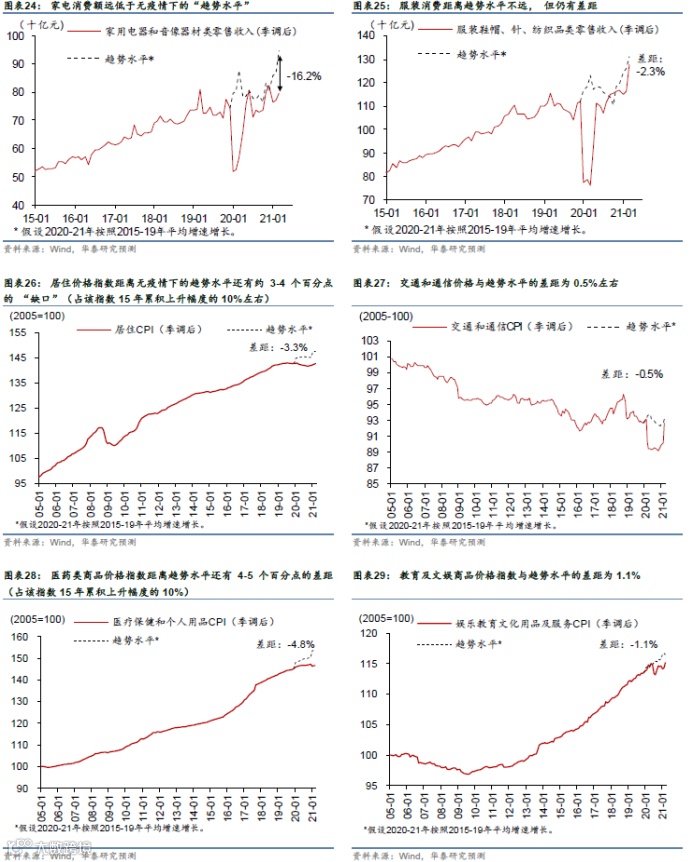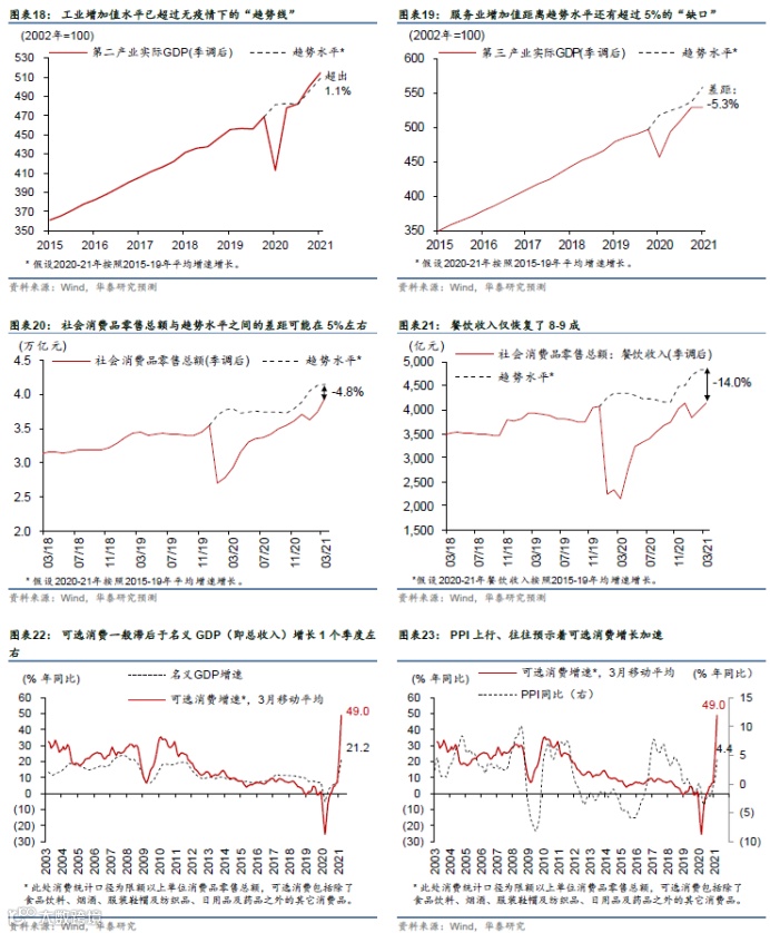 分行业产出缺口的测算显示,服务业复苏明显滞后于第二产业,随着收入增长和疫情影响逐渐消退、体验式服务的“自然”反弹空间更大。得益于强劲的外需及国内地产和基建投资拉动,实际工业品增加值已经超出无疫情下的“趋势线”(图表18)。而另一方面,服务业总增加值水平距离“趋势线”还有超过5%的“缺口”(图表19)。分行业看,鉴于医疗、金融、教育等领域的增加值水平已经回升至趋势线之上,所以其他服务业、尤其是需求弹性更高的子行业,距离趋势水平更远。