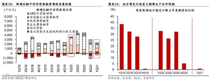 然而,增长无虞、意味着短期内政策可能缺乏放松的动力。从积极的方面看,消费推动下内需增长结构更为“平衡”、更具持续性。然而,需求强劲也可能会减轻政策“保就业、保市场主体”的压力。近几个月来,监管政策呈加速“正常化”之势,包括一系列加强房地产企业、非标融资、地方国企、以及(更近期的)对地方政府融资平台结构性去杠杆政策的出台,因此新增社融中的非贷款融资增速显著放缓(图表32,参见2021年4月13日发布的报告《信贷增速偏强但社融总体偏弱》)。与此同时,通胀上升环境下,长端国债收益率反而下行,债市表现好于预期。债市超预期的动力可能主要由于地方政府债发行进度不及预期、利率债供给偏弱。此外,今年一季度财政扩张也相比去年明显放缓(参见2021年4月22日发布的报告《一季度财政扩张力度减弱》)。如图表33所示,地方政府债券的发行进度明显慢于往年,迄今为止仅实现年初计划净发行量的0.8%。诚然,当前宏观背景错综复杂,预测短期利率走势较为困难,但消费需求走强可能会削弱短期内财政和货币政策放松的动力,同时也意味着上述趋于“正常化”的监管政策尚不至于打断周期复苏的势头。