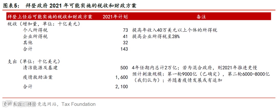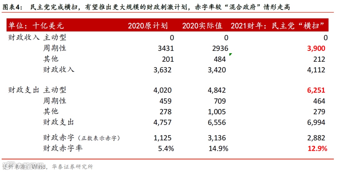 2021年一季度结束前,美国已确定和潜在(待落地)的财政刺激规模可能在1万6千亿美元左右,或将达到2020财年(2019Q4~2020Q3)美国全年名义GDP的约7-8个百分点。民主党在2021年1月的佐治亚州参议员决选中取得全部两个席位、从而完成实质意义上的“横扫”,有助于推进更可观的强刺激+加税+扩大基建的财政扩张组合。我们预计除在2021年1月已确定的9000亿美元抗疫财政刺激(2020年末获批)以外,在2021年1季度结束前,拜登政府可能还有6000-8000亿美元的追加刺激(规模和节奏取决于疫情发展)。