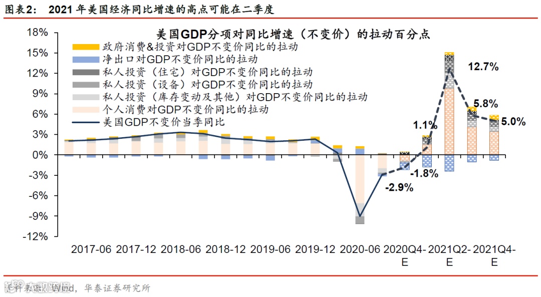 民主党在1月5日拿下佐治亚两名参议院席位、形成事实意义上的民主党“横扫”格局。鉴于此,我们将2021年美国实际GDP增速预测值从5.5%上调至+6%;预计同比增速高点在二季度,为+12.7%;预计环比高点在一季度,2021Q1环比折年率为+6.9%。预计2021全年现价GDP增速为+8.1%(此前预测值为+7.5%)。我们认为,2021年美国GDP的居民消费、库存、设备投资、政府投资分项,都可能更高于我们在《2021海外宏观展望:全球重启影响几何?》(2020/11/16)中的预期——尽管我们当时的预期值已可能是市场较高水平。由此,我们对全年美国GDP增速的预期值较目前市场主流预期高出超过2个百分点(美联储、OECD、IMF、世界银行对美国2021年实际GDP增速的最新预测均值为3.5%)。