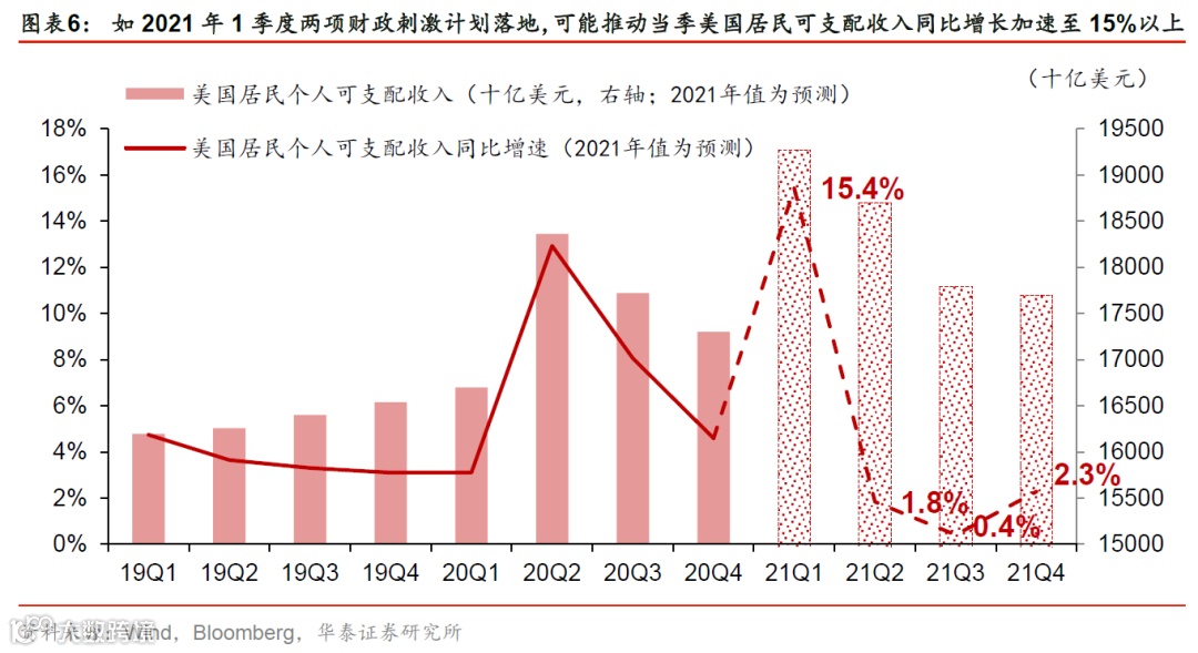 如2021年1季度两项财政刺激计划能够落地,可能推动1季度美国居民可支配收入增速加速至15%以上,大幅拉动美国消费及全球贸易需求。今年一季度美国名义经济增速有望明显高于去年Q2(当时为负增长),居民部门的工资性、财产性、经营性收入增速均有望高于去年Q2。2020Q2,在CARES抗疫财政刺激出台后,美国居民可支配收入同比增速当季上行到+13%;如新的两项财政刺激在今年一季度落地,我们预计美国居民可支配收入当季同比增速可能加速至+15%以上,消费需求和风险偏好可能进一步修复。短期内,美国进口需求可能加速扩张、拉动全球贸易活动和制造业周期回升——补库存和设备投资需求可能更具持续性。