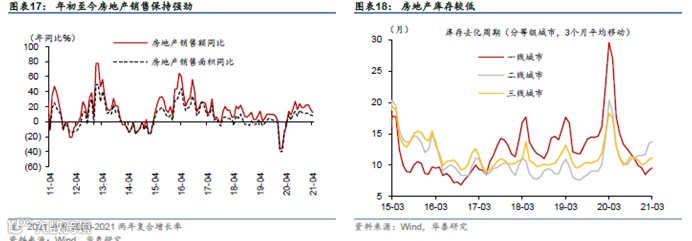 今年以来,地产投资增长较有“韧性”,最重要的支撑因素即为房地产销售相对强劲(图表17)。居民收入疫后反弹和相对较低的利率环境为房地产销售提供支撑,同时全国范围内来看,房地产库存水平刚刚开始低位回升(图表18)。但另一方面,地产相关政策持续收紧,降温已“在所难免”。1月起,绝大部分一二线城市从限购、限贷、限售等方面开始“补漏洞”。4-5月调控政策全面升级:中共中央政治局4月30日召开会议重申“房住不炒”,并明确提出“防止以学区房等名义炒作房价”。住建部约谈房企、整顿中介和经营贷,加大土地供应等措施频频出台。此外,住房信贷政策也有所收紧,例如4月上旬深圳、杭州和宁波等城市的银行相继上调房贷利率10-15个bp。