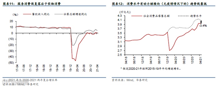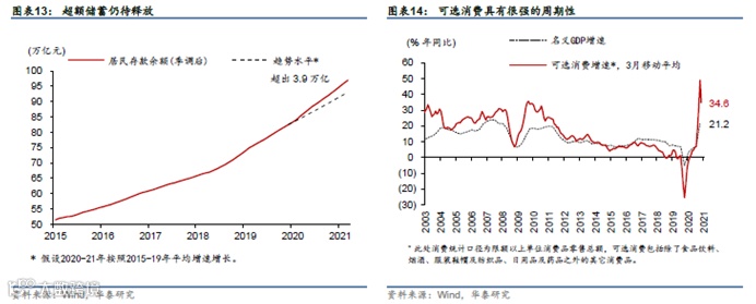 疫情期间,实物消费占比上升、服务消费占比下降是全球一致的趋势,而这一趋势在疫情更为严重、而收入补贴更为强劲的美国更为明显。中国过去5个季度这一趋势仍然延续,鉴于疫情降低了体验式消费需求、且缩小了消费活动“半径”(图表11)。正如我们在此前研究报告中的分析,由于疫情后收入增长领先消费、超额储蓄仍待释放,消费水平有动力继续向(无疫情情况下的)趋势线靠拢——即“补缺口”(图表12,参见《消费有望成为近期内需增长亮点》20210428)。而分品类消费中,体验式服务、更强周期性的高端消费、以及“抗通胀”消费品的需求可能恢复空间更大。相反,必选消费的上升空间有限。同时,国内地产相关消费可能滞后于地产成交而有所放缓(图表15)。