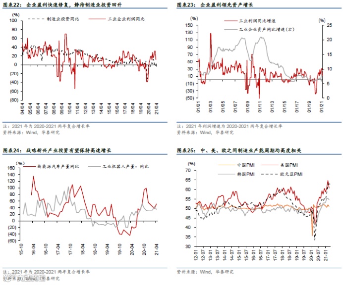企业盈利快速修复,静待制造业投资回升——企业盈利是制造业资本支出的领先指标。制造业企业的盈利能力已随PPI上行明显修复并远超出疫情前水平,为制造业资本开支回升打开空间——剔除基数影响后,1季度工业企业盈利增速从去年4季度的21%进一步加快至22.6%,利润率(季调后)则从20年4季度的6.3%上升至7.8%(图表22)。工业企业盈利能力与其资本开支周期间的因果关系是显而易见的——中国PPI回升、制造业盈利改善明显领先企业资产负债表扩张和制造业投资增速(图表22和23)。即便在2016年供给侧时,二者相关性有所减弱但仍明显存在。供给侧改革主要针对国企主导行业,而近年来国企在盈利回升时重点进行环保升级、去杠杆及肩负了一些战略性投资的任务。换句话说,一些此类细分行业盈利上升可能并没有加大狭义的产能投资或者增加产量,但仍然间接推动了其他行业的投资、或带来更广泛意义上的成本下降/效率提升。