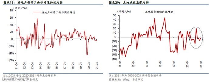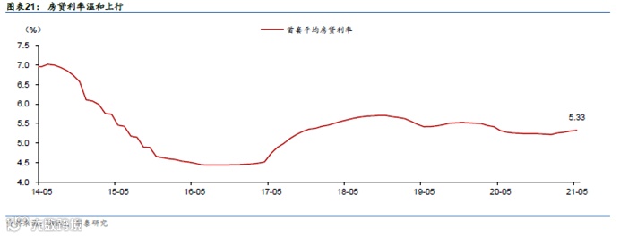 我们预计下半年房地产投资的增长势头可能减速至5%左右,明年2-3季度左右见底,主要是基于:1)从总需求的角度看,居民收入和收入预期回升环比最快的阶段可能已经过去;2)房地产投资的一系列领先指标明显走弱:房地产新开工面积增速从2020年底的6.3%下降至2021年4月的-5.4%(2020-2021复合增速),土地成交面积同比增速自去年7月以来连续负增长(仅12月除外,2021年取两年复合增长率),这意味着新开工面积同比增速可能进一步下降(图表19和20);此外,如果房地产市场预期走弱,开发商开工的周期也可能进一步延长。3)房贷利率开始温和上行——全国42城的首套房贷利率已连续4个月环比上升(图表21);4)持续的监管政策收紧导致房地产开发商的现金流承压,尤其是中小型开发商;5)相较土地成交而言,建安投资可能相对稳定,维持在个位数水平。