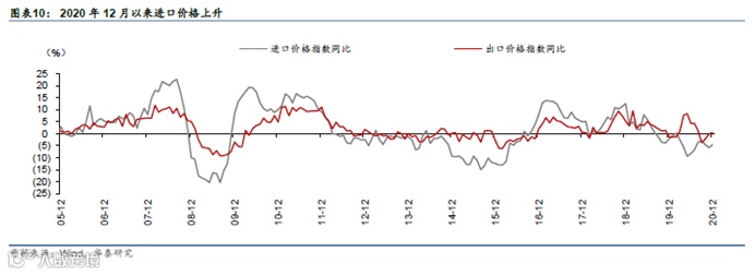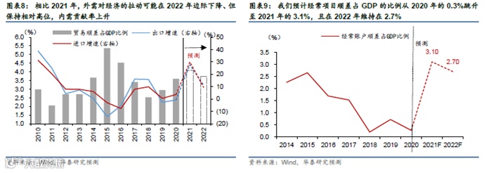 需求板块看,相比2021年,外需对经济的拉动可能在2022年边际下降、但保持相对高位,内需贡献率上升。与我们对全球增长路径的预期相呼应,2021年4季度开始外需对经济增长的提振效应可能边际减弱。具体看,2021年2-4季度我们对(美元计价)出口同比增长的预期为34%、27%、18%。虽然同比增长快速下降,但主要是由于基数回升。环比看,2-3季度出口环比增长保持高位,且全年贸易和经常项目顺差均保持在5年高位。虽然出口增长在2022可能减速至10%左右,但总体仍高于2018-2019的平均增长(图表8)。我们的进出口预测隐含名义海关货物贸易顺差占GDP比率从2019年的2.9%、2020年的3.6%,上升至2021年的4.1%,而2022年仍保持3.7% 的高位。此外,由于服务贸易逆差大幅缩水,相比海关货物贸易顺差,经常项目顺差扩大对GDP的拉动效应将更加明显——具体走势看我们预计经常项目顺差(current account surplus)占GDP的比例从2020年的0.3%跳升至2021年的3.1%,且在2022年仍维持在2.7%的高位(参见《从BOP再谈人民币升值的效率逻辑》20210524)。值得注意的是,由于进口价格指数上升快于出口价格指数,实际顺差对实际GDP增长的贡献可能比名义值更高(图表10)。