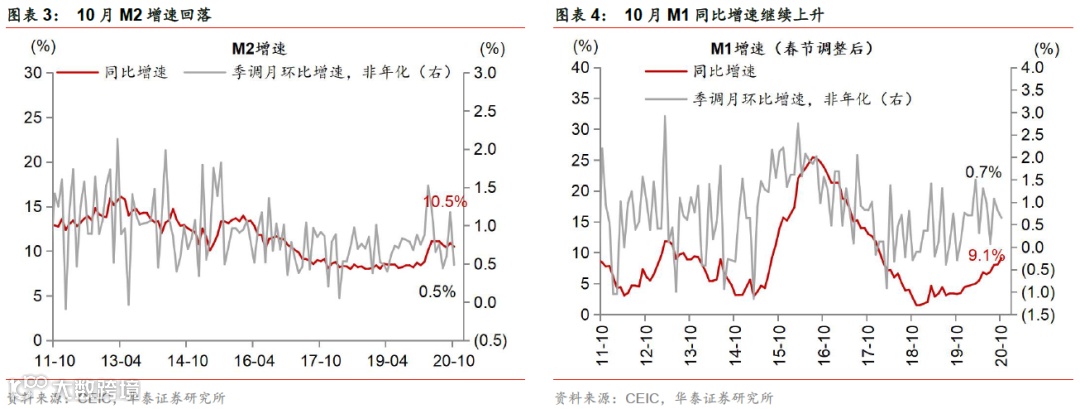 3) 10月M2同比增速从9月的10.9%回落至10.5%,低于市场预期的10.8%,主要受居民储蓄同比多降和财政存款多增拖累(图表3)。经季节性调整后,10月M2月环比(非年化)增速从9月的1.2%明显放缓至0.5%。由于财政资金拨付滞后,10月财政存款环比上升9,050亿元,升幅高于去年同期的5,551亿元,拖累M2增速约0.2个百分点。由此,10月财政存款同比增长从9月的-2.9%回升至3.9%。10月M1同比增速从9月的8.1%加快至9.1%,季调月环比增速从9月的0.8%微降至0.7%、但仍保持较高水平,显示企业现金流持续修复(图表4)。
