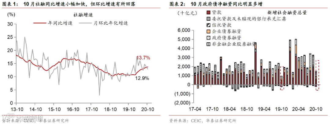 1) 10月新增社融1.42万亿元,明显高于去年10月8,680亿元的新增额。分项来看(图表2),10月政府债净发行4,931亿元,明显高于去年同期的1,871亿元。同时,10月企业债净融资2,522亿元,高于去年同期的2,032亿元。10月股票净融资927亿元,高于去年同期的180亿元。另一方面,10月信托贷款、委托贷款与银行未贴现承兑汇票等“非标”资产合计余额环比下降2,138亿元,略低于去年10月2,344亿元的降幅,但今年9月环比微升27亿元。