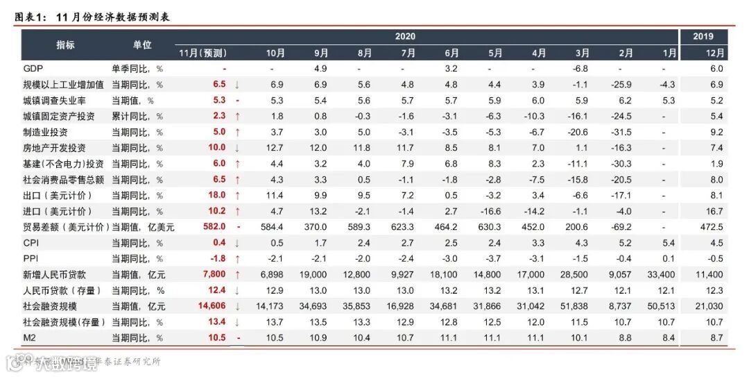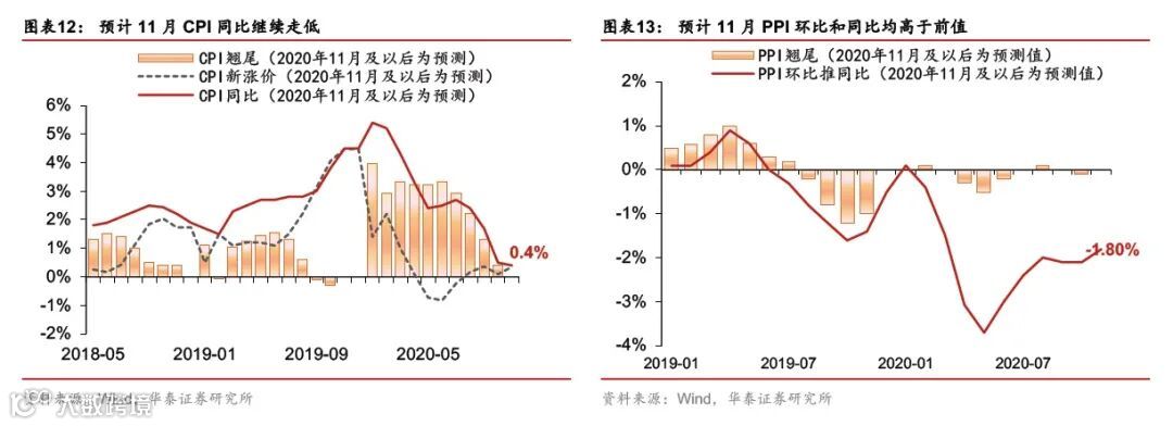 预计11月CPI同比+0.4%、继续下行,PPI同比-1.8%、跌幅收窄。在猪肉价格可能持续下行的推动下,预计食品通胀同比继续回落;油价短期难以大幅上行,非食品通胀短期维持低位。往前看,温和再通胀趋势并未改变,明年一季度末或开始加速上行(对应今年一二季度基数的逐渐下行)。此外,全球经济重启成为关键词,国内外工业品价格或出现共振。疫苗研制进展加速可能会提振全球消费需求、拉动石油价格回暖。三季度以来,国内企业现金流和盈利有所改善,叠加全球工业品价格潜在回暖趋势,我们预计整体PPI有望继续复苏,且明年一季度末可能会加速上行。