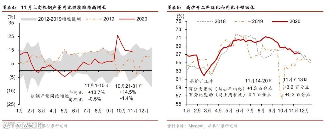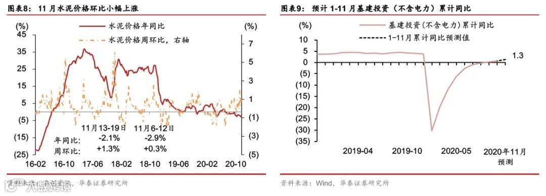 我们预计1-11月基建投资(不含电力)累计同比回升至+1.3%左右,当月同比+6%(前值+4.4%)。从预算情况来看,下半年基建投资扩张有较为充足的财政资金支持,国内疫情基本平息后,多地新推出重大项目投资方案,我们预计资金投放到项目上的速度有望加快,带动基建投资上行。部分工业原材料如水泥、玻璃等的价格,11月环比小幅上涨;铁矿石、有色金属等11月份同样呈现上涨,说明基建投资后劲仍然较足,可能存在年前(春节前)赶工需求。