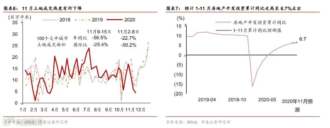 预计1-11月房地产开发投资累计同比+6.7%左右(前值+6.3%),当月同比回落到+10%(前值+12.7%)。土地成交热度下降,叠加融资政策收紧,土地购置费对投资的拉动作用可能弱化,但我们预计房企融资政策收紧不会触发投资骤然下行的风险,尤其是部分一线和新一线城市的房价上涨预期仍在(如上海放宽应届生落户等因素),已开工的项目仍有加快完工推盘的诉求;短期地产投资增速有望保持在高位区间。