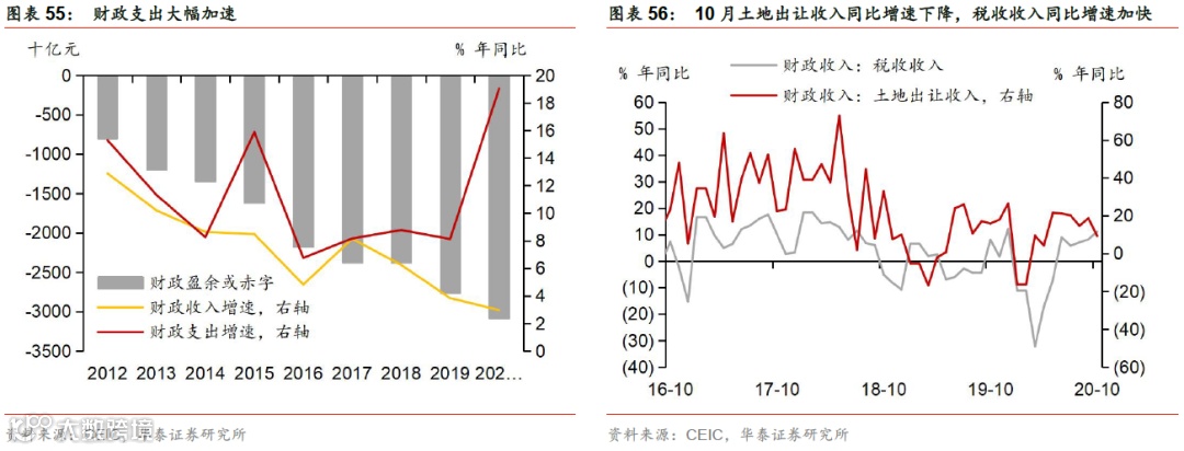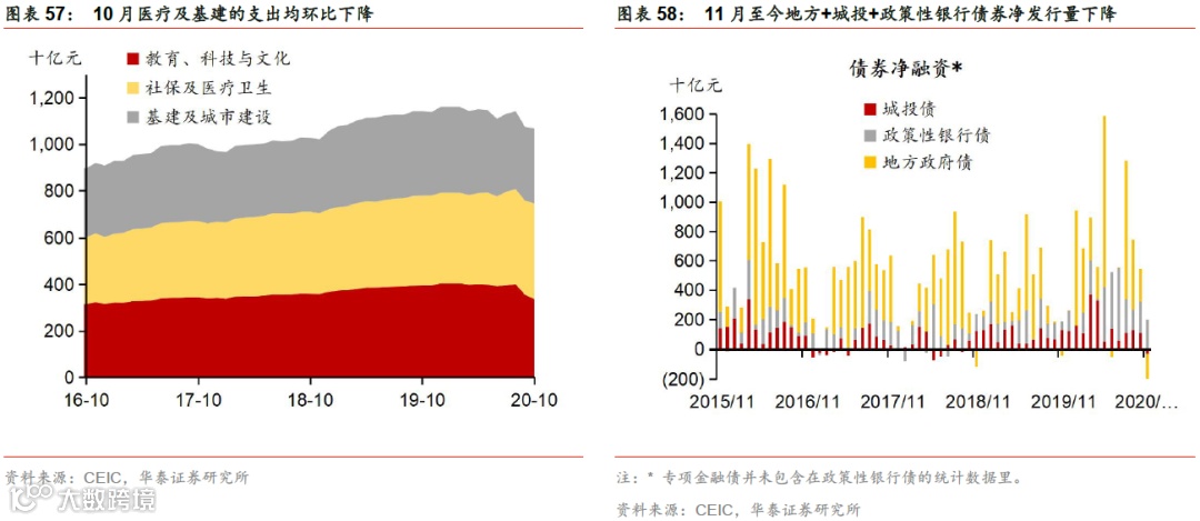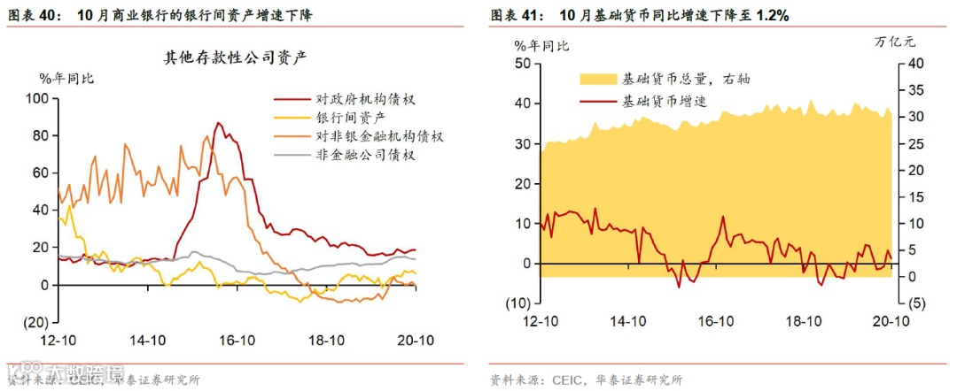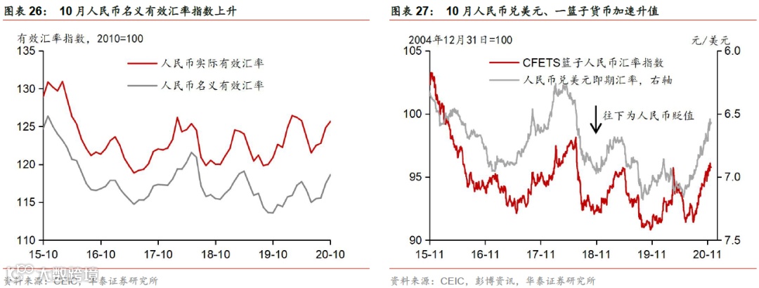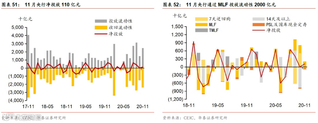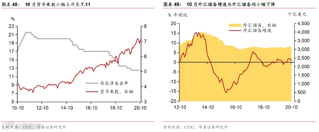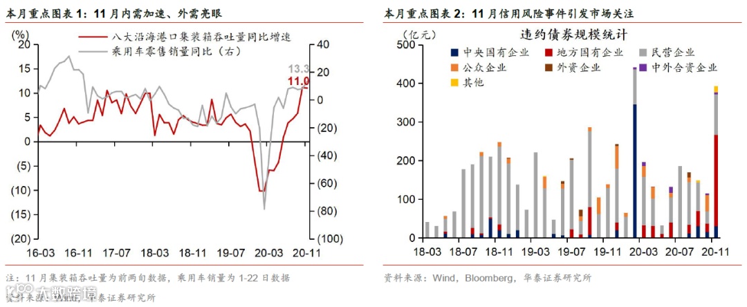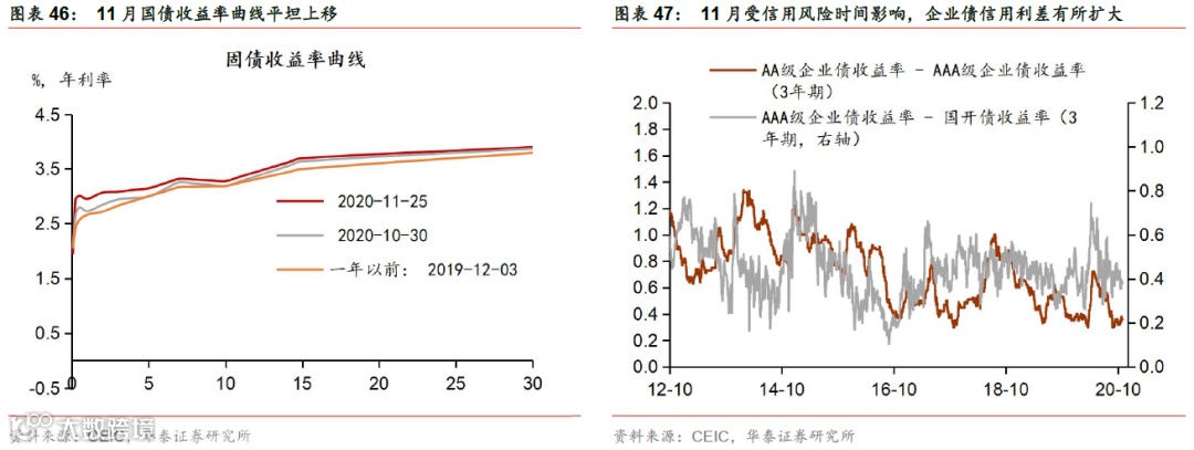 11月信用风险事件引发市场关注,市场信用分层。11月出现地方国企违约事件,引发债券违约规模显著上升至367亿元(重点图表2),其中地方国企违约金额已达216亿元。此外,全月企业债净发行量跌至负值、企业债信用利差扩大。风险事件发生后,央行超量续作MLF部分缓解了市场恐慌情绪。整体来看,流动性环境仍处紧平衡:11月央行维持LPR报价不变,流动性净投放110亿元。相较上月末,7天回购利率下降约50个bp,但债券收益率曲线进一步平坦上行,10年期国债上升13个bp。11月政府债发行有所回落,截至11月27日,国债净发行5,169亿元,地方债净到期2,479亿元,或对社融构成一定拖累。汇率方面,11月人民币加速升值,兑美元升值1.89%,兑一篮子货币升值0.55%。