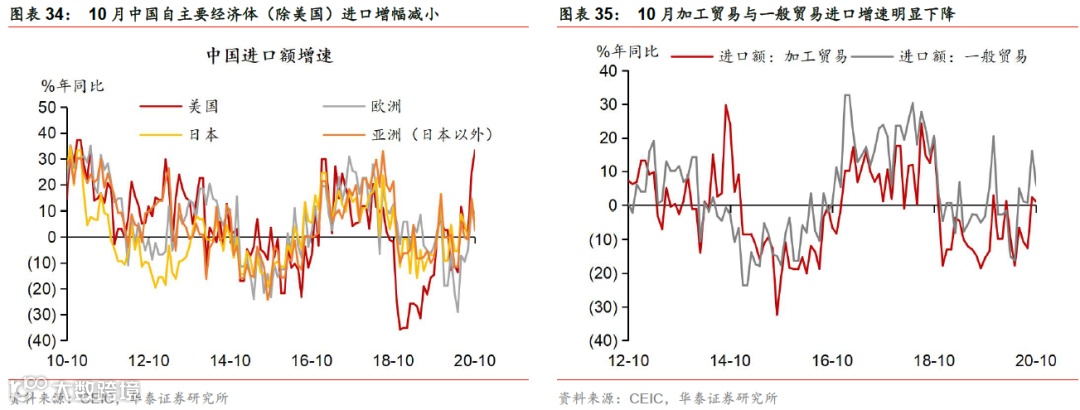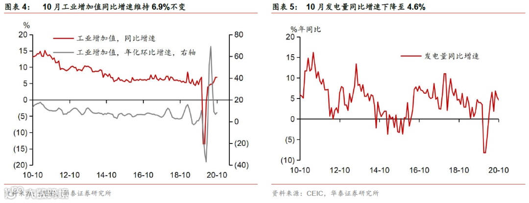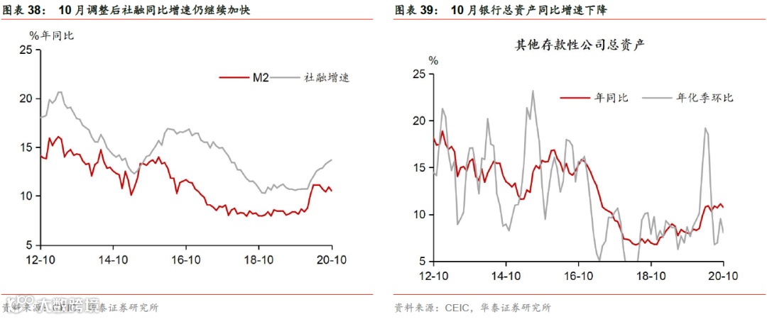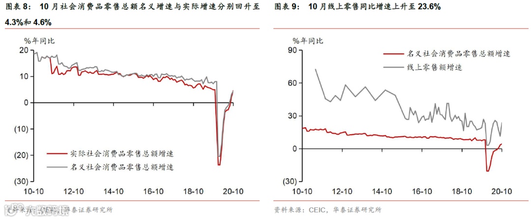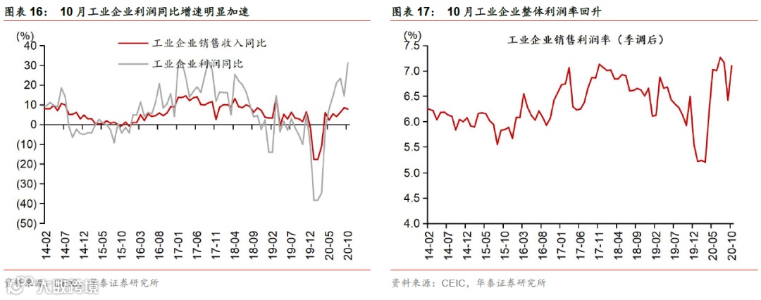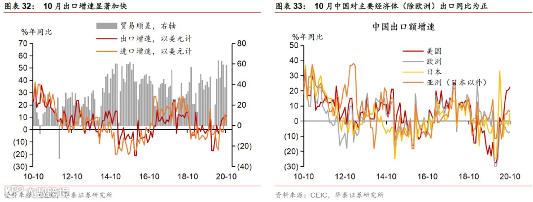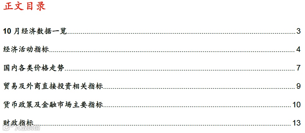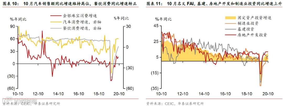 10月宏观数据回顾——出口如期高增长,当期投资稳健、消费加速回暖;社融环比增速微降、税收及制造业收入顺周期加速。10月出口同比增速继续上行至11.4%且贸易顺差扩大。在工作日同比少两天的情况下,10月工业生产保持强劲,工业增加值同比增速持平于6.9%;基建、地产投资展现韧性,制造业投资稳步复苏;可选消费、服务消费进一步回升,汽车销量同比增速达12%。通胀保持低位,主要是食品价格压制整体CPI,但核心CPI回升趋势不变,PPI也有望加速回升。政策方面,货币开始趋于中性而税收收入顺周期回升——社融环比增速放缓至12.9%。