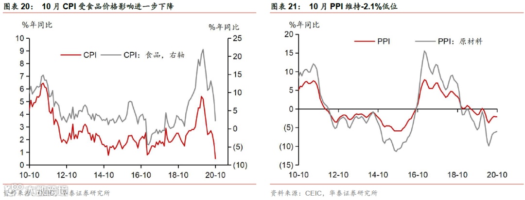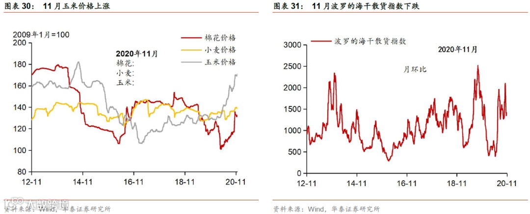 可选消费持续恢复;入冬生产与投资降温、但仍强于一般季节性。地产市场有所降温。外需增长继续冲高,集装箱航运“一箱难求”(重点图表1)。PPI环比回升。内需方面,11月至今投资活动保持活跃。虽然随天气转冷,中上游企业开工率环比小幅回落,但结合成交量、价格及库存等指标看,终端需求仍较为强劲。此外,可选消费进一步复苏、汽车销售维持迅猛的增长势头,11月以来乘用车零售额同比增长13.3%,较上月继续加速。另一方面,房地产市场较为平淡,商品房、土地成交面积同比增速均有所下滑。外需方面,出口的强韧性继续演绎,中国出口集装箱运价指数(CCFI)持续创新高,同时11月前两旬中国八大主要港口的集装箱吞吐量同比增长11%,相较于10月前两旬的13%略有下降但仍维持高位。11月食品价格继续走低、整体通胀或较温和,但国内工业品价格持续上行。
