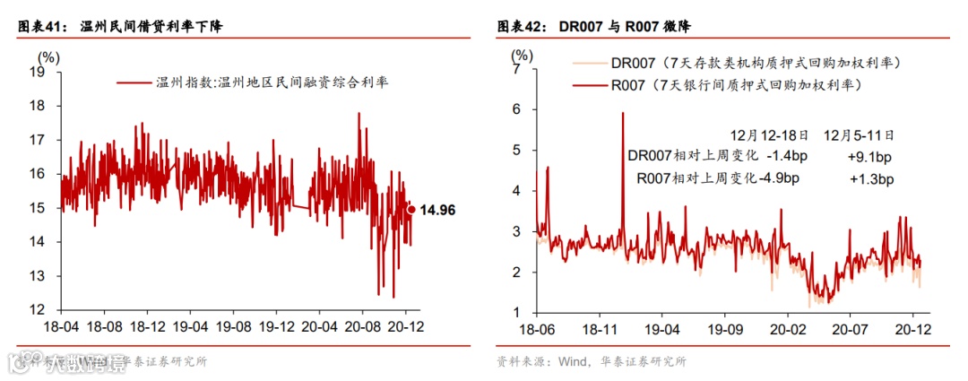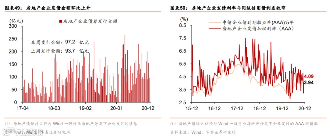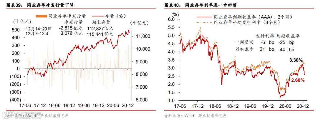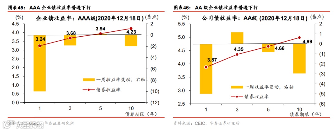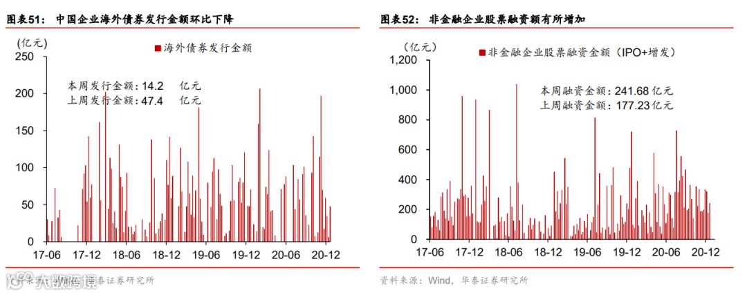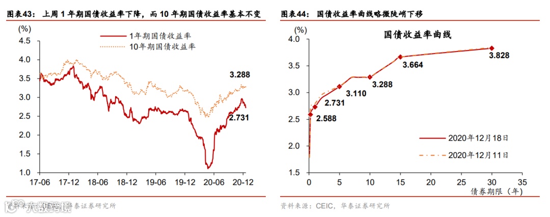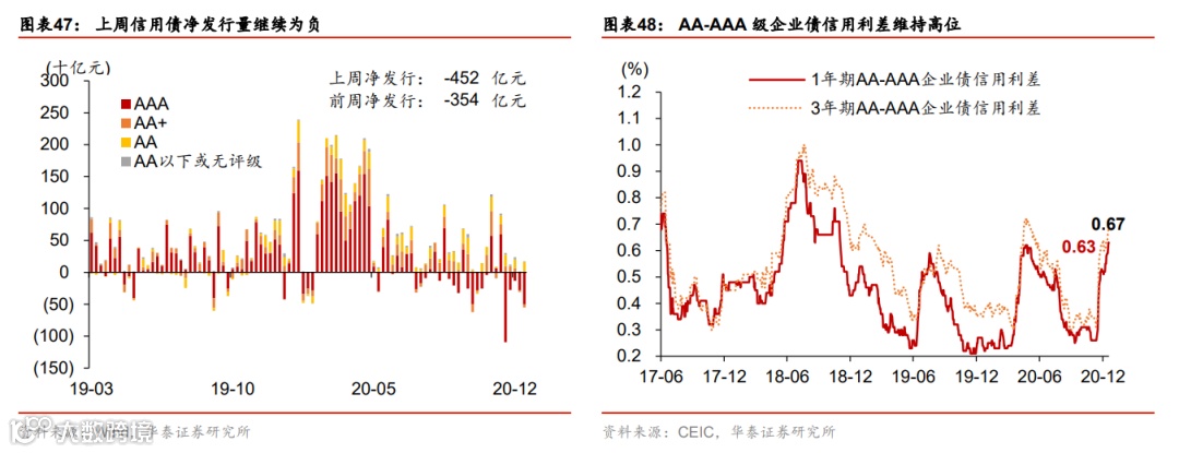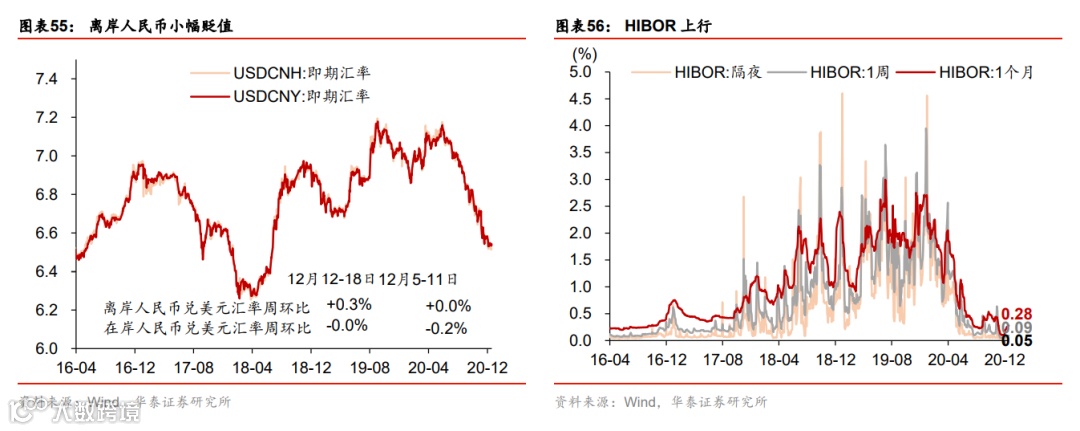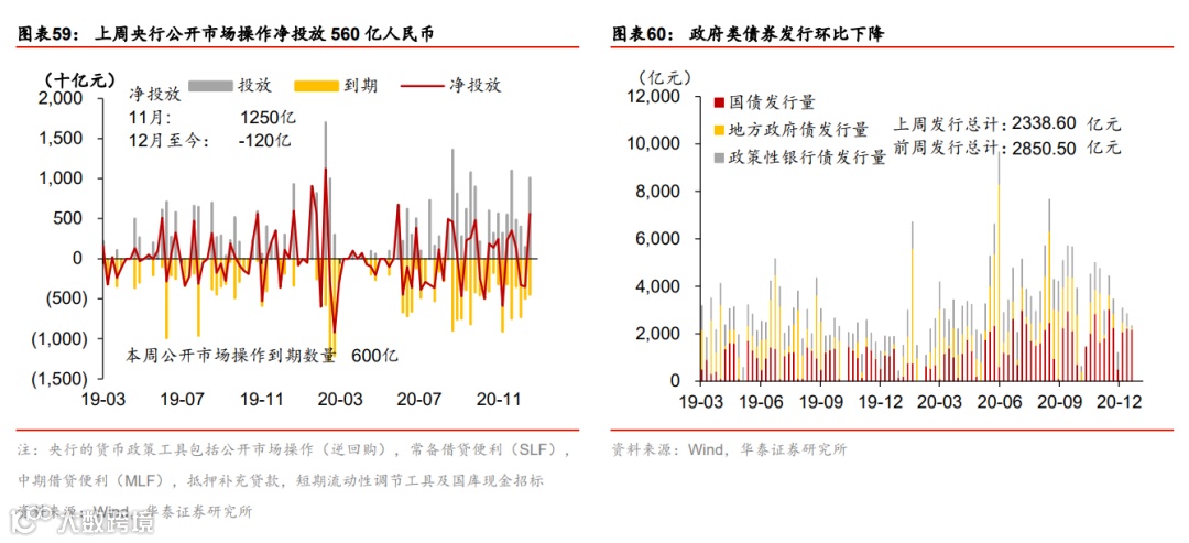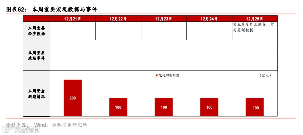 流动性环境边际宽松;人民币成交活跃。上周央行超额续作MLF,净投放3500亿MLF,充分满足了市场的流动性需求,主要是为了缓解银行年底阶段性的负债端压力,同时继续支持专项债和再融资债券发行。银行间利率和短端债券收益率普遍下行,同业存单收益率继续下降,但长债收益率基本未动。另一方面,信用利差继续高企而信用债发行低迷,显示此前信用债违约的“余波”仍在。政府债发行保持较快节奏,单周净发行量2339亿元。人民币汇率兑美元汇率保持稳定,兑一篮子货币小幅贬值,但成交相当活跃,单周达4650亿美元。