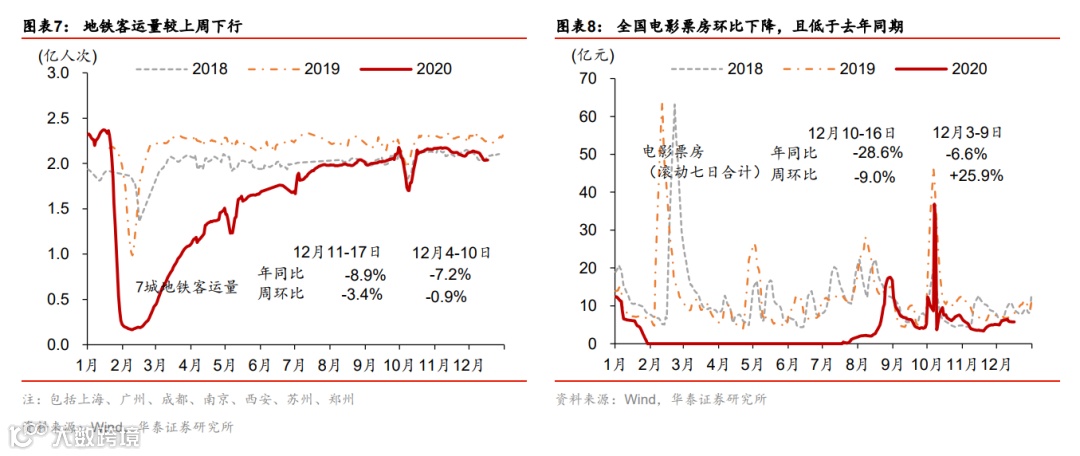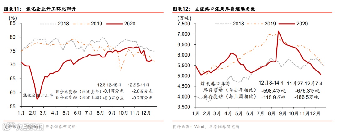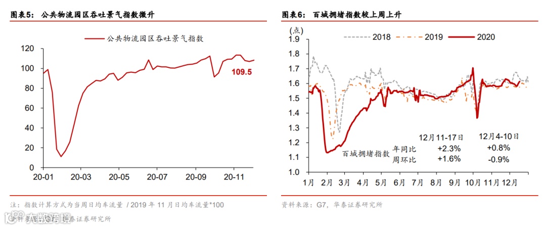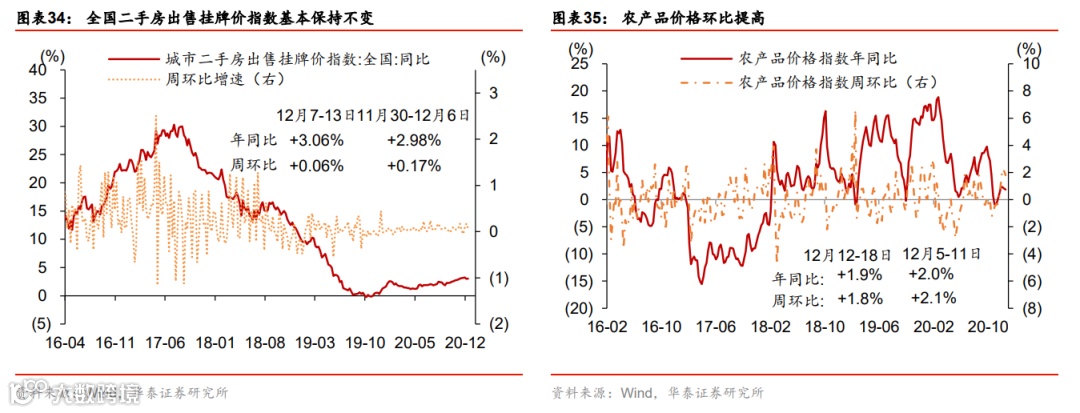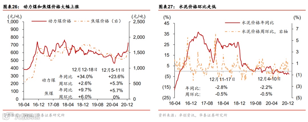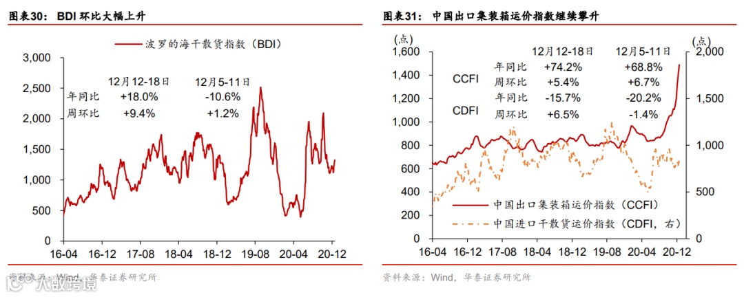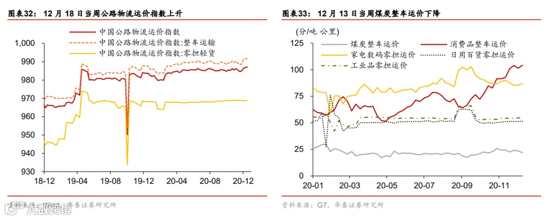 国内外工业品价格共振上涨;出口运价指数再创2002年以来新高。上周布伦特油价环比跳升4.6%。寒冷天气下用煤/电需求快速上涨,且近期供给偏紧,国内煤炭(动力煤及焦煤)价格继续大幅上涨,尤其是焦煤价格环比跳升6%。此外,钢铁及有色价格亦大幅上涨。不过中下游产品如化工、水泥和化肥等价格暂时保持平稳。集装箱供给极度不足环境下,出口运价指数持续攀升至历史新高,其中地中海航线和东南亚航线增幅最为显著,显示欧洲和东南亚国际进口需求可能最为强劲。上周国内运价也普遍有不同程度上涨,食品批发价格环比上升。