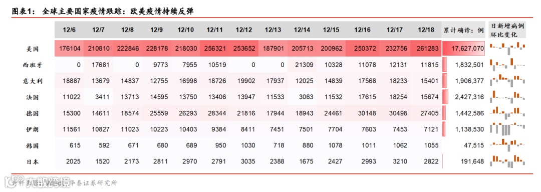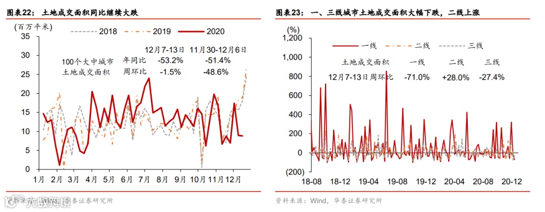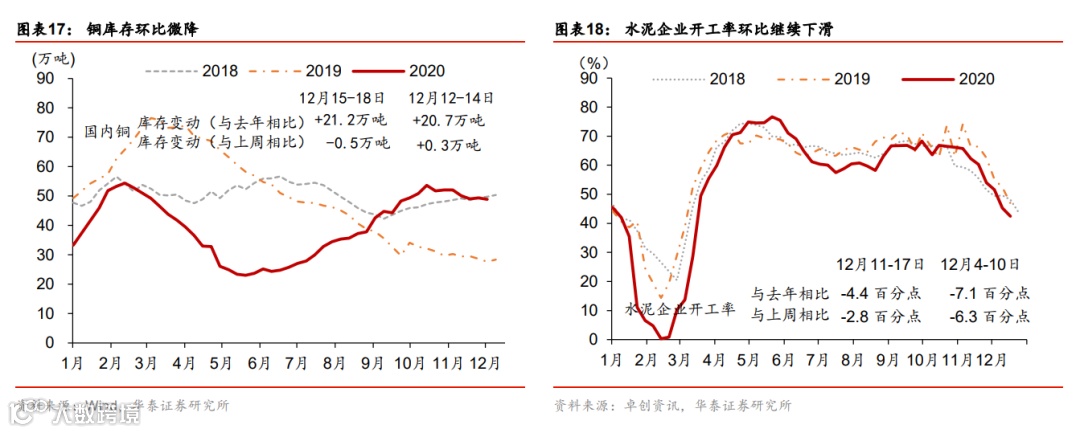 总体而言,投资、消费、出口需求均保持强劲。尽管上周煤炭和高炉开工率小幅上升,但工业品需求强劲导致快速去库存持续进行,其中煤炭库存已显著低于过去两年水平。中下游的水泥和汽车等企业的开工率则可能部分受到“限电”影响,有所下降。汽车销售保持高速增长,同比增速为14.8%。临近年底,国内物流及航班数环比有所上升。房地产成交保持正增长,但土地成交继续大幅下滑——上周房地产成交面积同比增长4.9%,但土地成交面积同比大幅下降53.2%。
