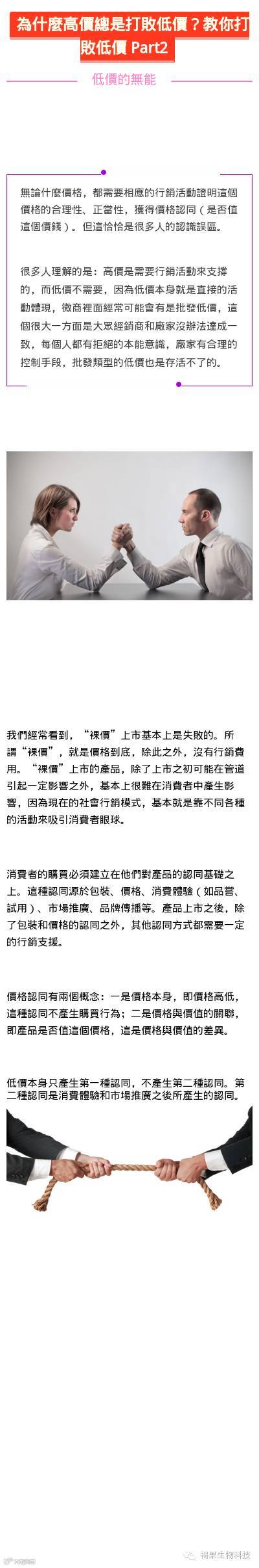 所以當大家靜下心來分析以後就會發現其實低價並沒有想像中可怕,低價就代表了太多的不可能,你在代理一款產品,每個人都去正義維護規則,堅決抵抗低價,這是保證了產品的壽命,給你帶來的是長久的財富,每個人面對低價,都有自己的理解和做法,但是每一種情況的結果就是越做越低迷,越來越多的去依靠低價贏得短暫利潤從而丟掉了真正賺錢的能力,這是下下策。
