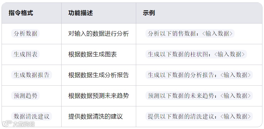 6、数据分析与可视化指令:支持数据清洗、分析、图表生成、趋势预测等。