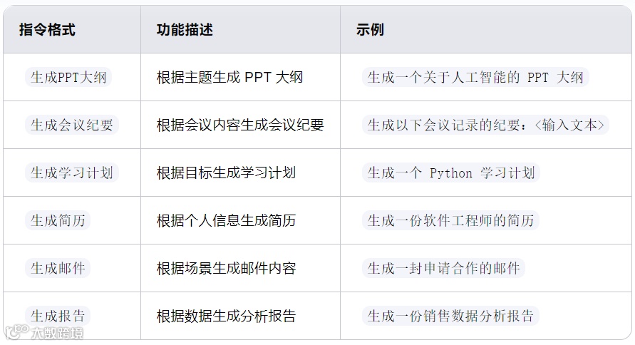 3、办公与学习指令:可生成 PPT 大纲、会议纪要、学习计划、简历等,助力高效办公。