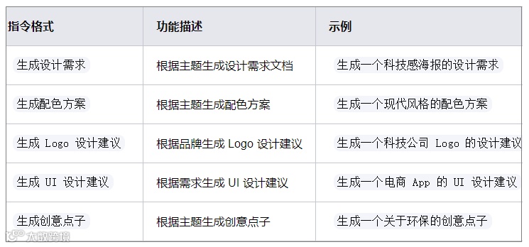 5、设计与创意指令:生成设计需求、配色方案、Logo 建议等,激发创意灵感。