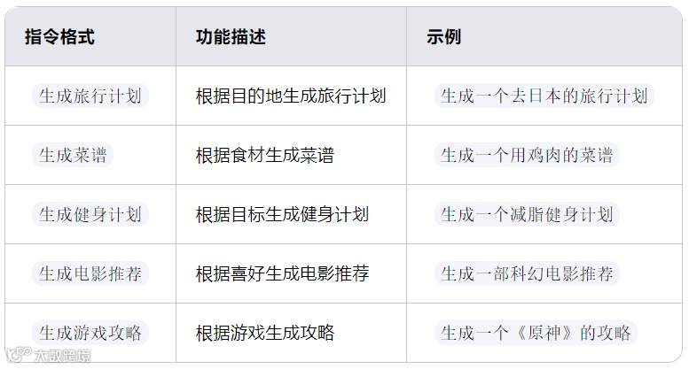 2、内容创作指令:支持生成文章、故事、诗歌、短视频脚本等,满足不同创作需求。