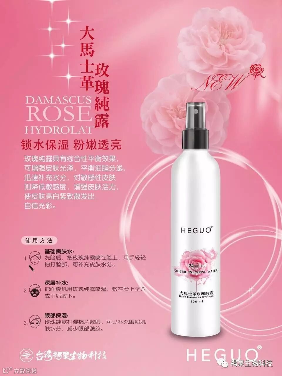 HEGUO玫瑰纯露中封存了花的巅峰生命能量。多重活肤精华融于一滴,接近肌肤结构的理想水油比例,更快速渗透,能促进皮肤细胞再生,深层渗透保湿美白,是各类化妆水的巅峰之造。