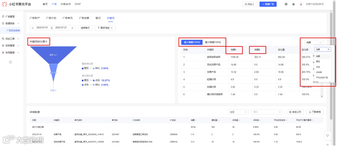 关键词增幅/降幅排行:展示关键词的环比数据变化,如消费、展现、点击等维度。“消费1”是指当前所选时间的消费,“消费2”是指消费1往前同样天数的消费。如“消费1”是7.1-7.17的消费,“消费2”则是6.14-6.30的消费,即往前数相同天数。