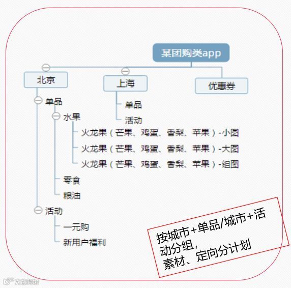 搭建方法:1.按素材,适用于产品相对单一多场景化制作素材进行分组;2.按产品,产品类型丰富的广告主,可以根据不同的产品类型进行分组;3.按地域:适用于不同业务在不同的地域特征进行分组;4.按时间,根据常规活动,品牌活动的不同时间进行分组