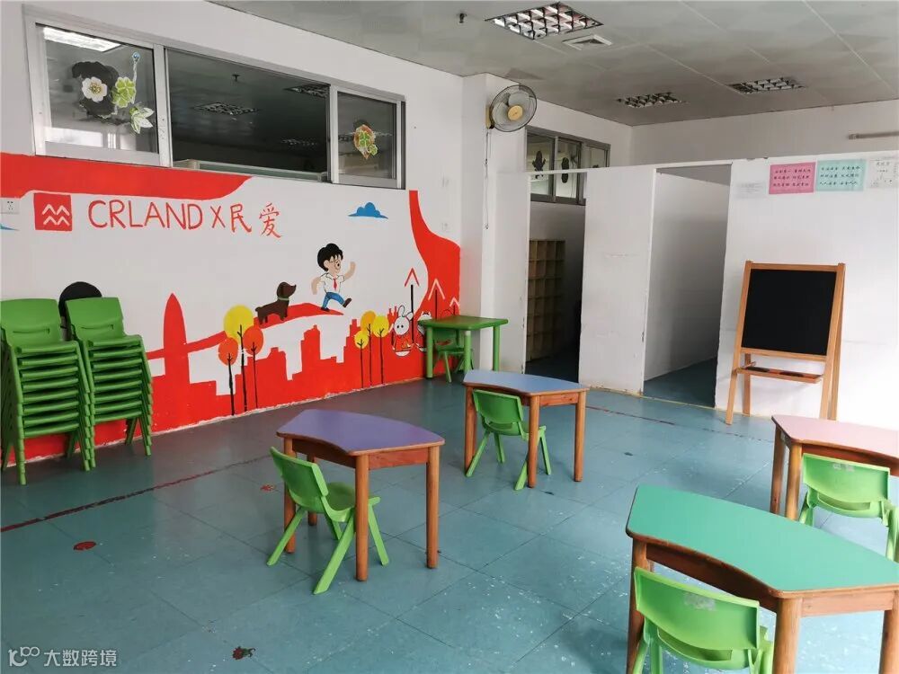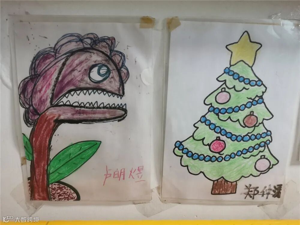 (墙上贴着孩子的绘画作品)