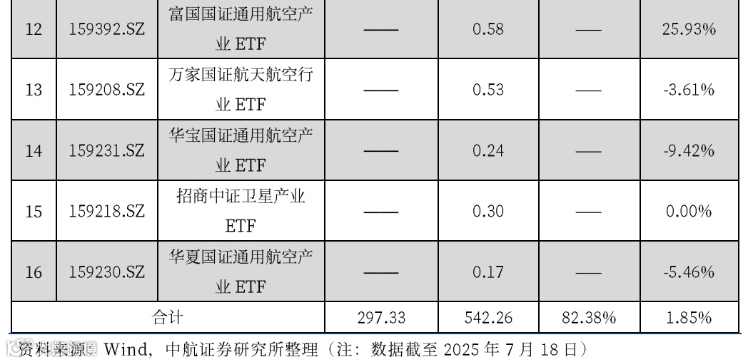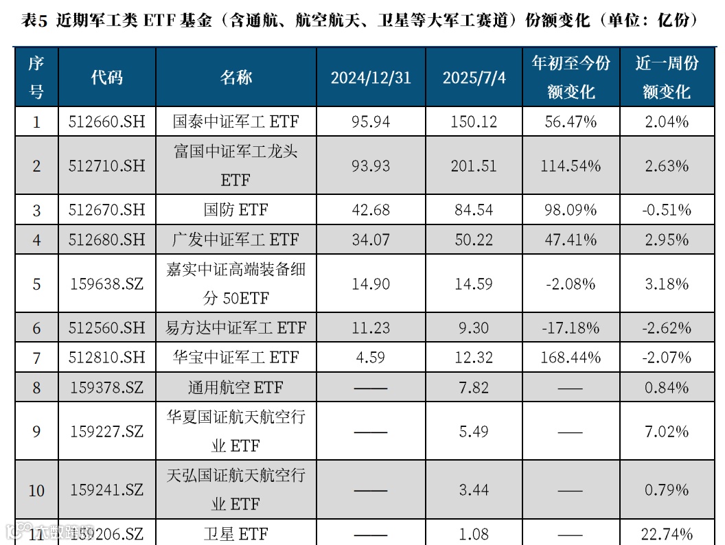 ① 资金面上,被动增量资金大量流入。2025年以来,截至7月18日,军工领域(含低空经济、商业航天等大军工领域)的主题ETF规模由年初的297.33亿元增至542.26亿元,增幅超过82%。份额方面,规模较大的国泰中证军工ETF(+56%)、富国中证军工龙头ETF(+115%)、国防ETF(+98%),广发中证军工ETF(+47%)的份额均较年初高速增长(具体数据见正文6.2节)。大军工主题基金,时隔多年密集发行,跟踪低空经济、商业航天等大军工主题指数的多个ETF也在2025H1集中发行,当前合计规模已经接近19亿元;