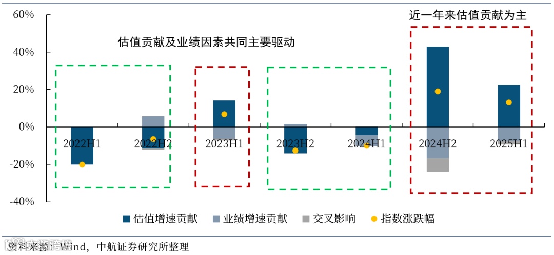 如下图所示,截至2025年6月30日,按照半年度拆分来看,2022年以来,军工行业(申万)半年度涨跌幅分别为-20.05%、-6.57%、6.76%、-12.69%、-10.03%、19.01%以及12.99%。军工行业自2024年下半年以来,走势呈现震荡上行态势,其主要驱动因素为估值驱动,即“拉估值”。