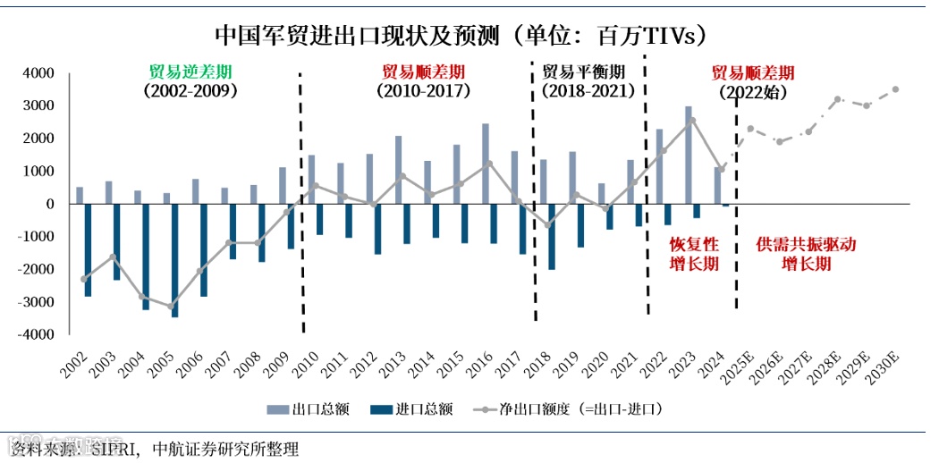 最近两年来,随着国际局势的波云诡谲,俄罗斯等传统军贸大国的出口缩减,同时受益于我国国防科技工业体系的完善和国产替代能力的提升,我国军贸出口量显著增长,带动净出口额显著提升。我国或将进入下一个贸易顺差期。