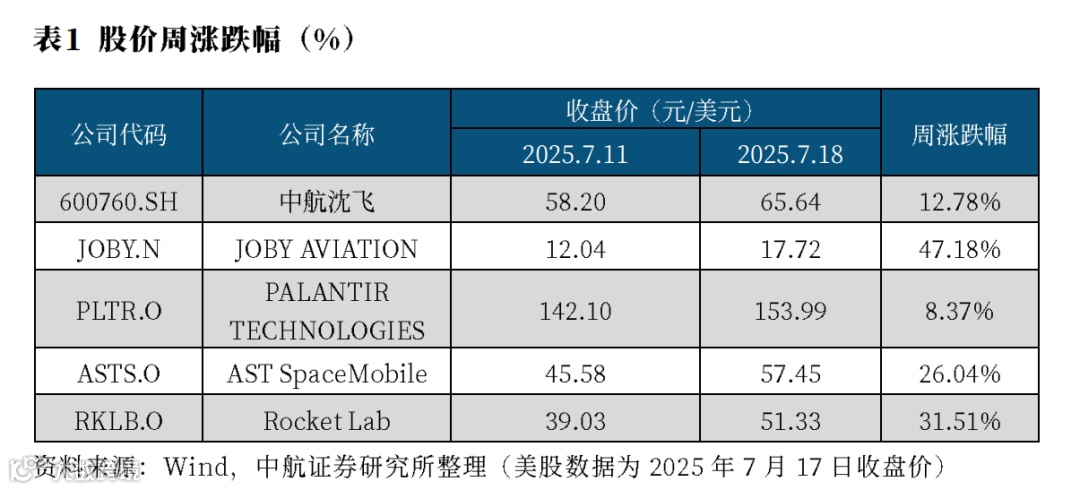 本周,军贸、海外低空经济、军事智能化、商业航天等概念股迎来大幅上涨,多个股票如中航沈飞,海外企业JOBY、PALANTIER、AST SpaceMobile、Rocket Lab等均创下历史新高。