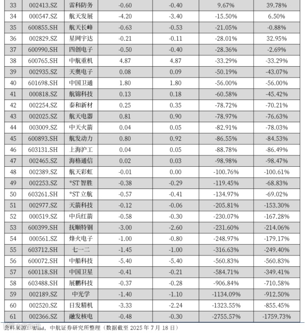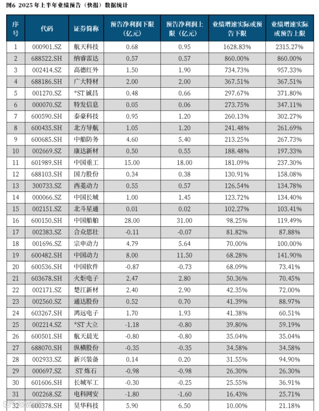 截至2025年7月18日,共计61家企业公布2025年半年度业绩预告、快报,其中33家业绩预增,28家业绩预减。涨幅居前的上市公司主要围绕船舶、防务、航天等产业链。如净利润方面,航天科技预增长1628.83%-2315.27%,纳睿雷达预增长860.00%,高德红外预增长734.73%-957.33%,广大特材预增长367.51%,北方导航预增长241.48%-261.69%,中国重工预增长181.09%-237.30%等。