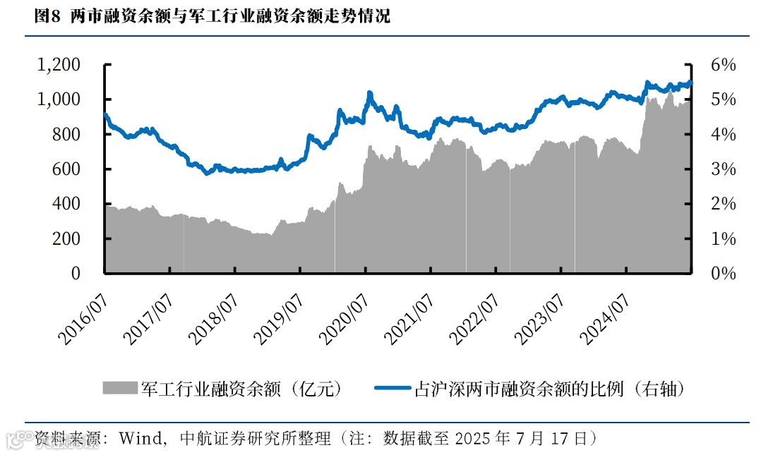 截至2025年7月17日,军工行业的融资余额合计1029.10亿元,比上周环比上涨1.01%,占两市融资余额比例为5.46%。
