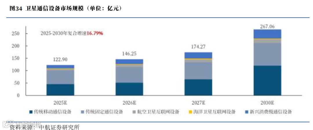 卫星通信设备2025年市场规模有望达到123亿元,2030年有望达到267亿元,2025-2030年复合增速约16.79%,其中,传统通信设备依然占比最大,但航空卫星互联网以及新兴消费级直连卫星通信领域增速更快。