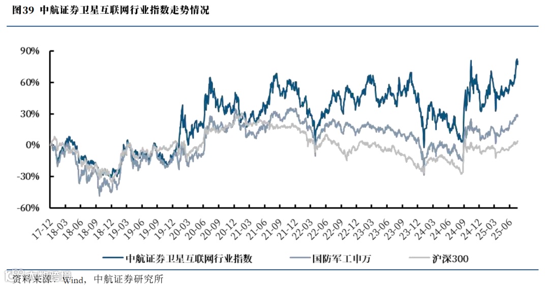 卫星互联网板块在二级市场当前展现出显著的超额收益特征。截至2025年8月15日,中航证券卫星互联网指数年内涨幅达24.81%,超过国防军工(申万)3.07个百分点,超过沪深300指数18.02个百分点。这一表现的核心驱动力来自政策落地与发射事件的双重催化,如国网星座与千帆星座的频繁发射,市场对这类事件的敏感性较高,短期主题投资特征显著,资金围绕卫星制造、载荷配套等核心环节快速轮动。