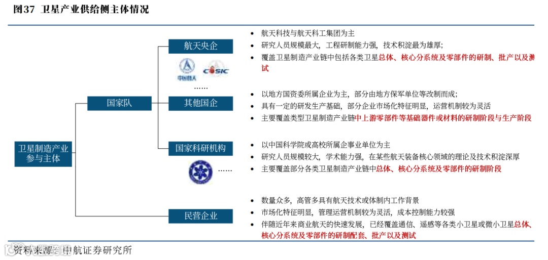 由于卫星制造产业具有系统性强,协作面广的特点,因此参与其中的主体众多,按照单位性质可以分为两大类:以航天央企、其他国企或国家科研机构为代表的“国家队”,以及民营商业航天企业。