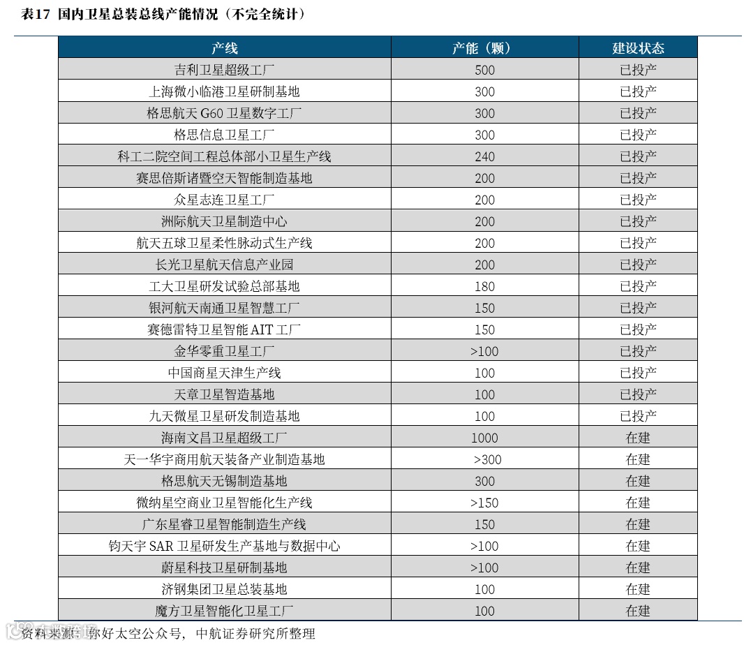 从国内卫星制造产能情况来看,在我国卫星制造需求侧,特别是小卫星制造需求有望迎来提速的背景下,多家“国家队”以及商业航天卫星制造总装企业已经建设了批量化柔性小卫星生产产线,卫星制造企业收入与盈利也有望进一步度提升。