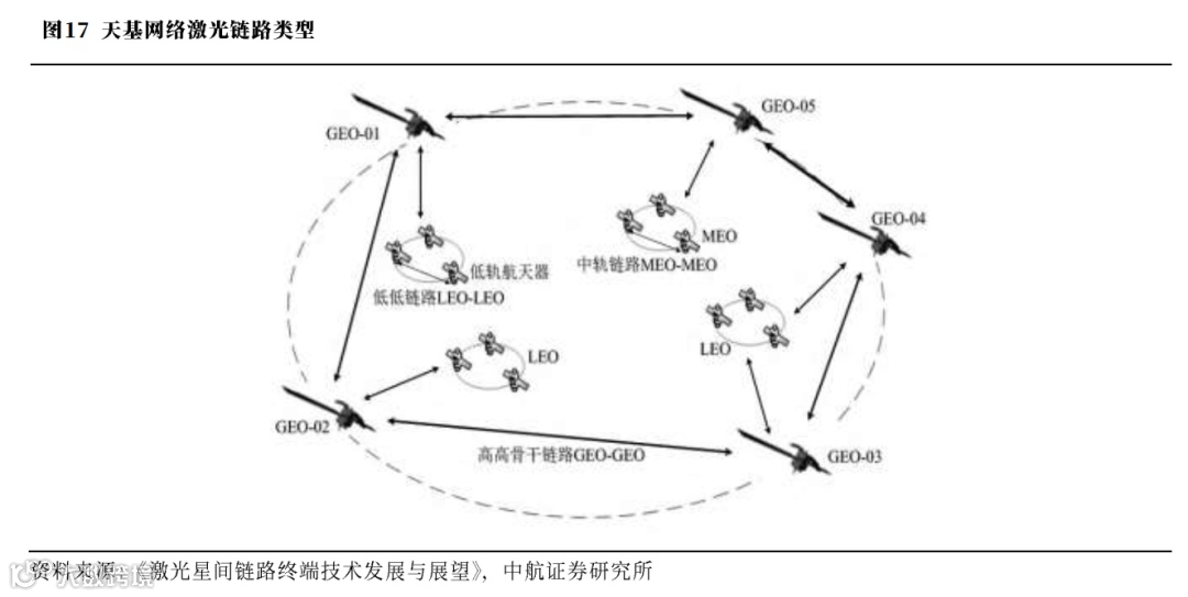 ③甚高速率小型化星间激光通信技术。未来天基组网要求更高通信速率、更小星载终端规模和更低的终端成本,需要全新的在轨光处理、交换和激光终端实现技术。需要突破的关键技术方向包括:1)100 Gbps量级小型化星间激光终端技术;2)星载抗辐照长寿命光器件技术;3)高动态星间星地激光链路捕获与跟踪技术。