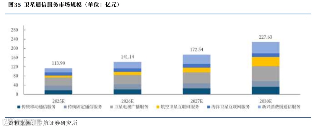 卫星通信服务2025年市场规模有望接达到114亿元,2030年有望达到227.6亿元,2025-2030年复合增速达14.85%。其中,航空、航洋卫星互联网以及新兴消费级直连卫星通信领域增速较快。