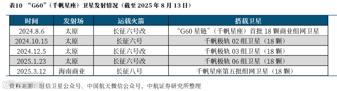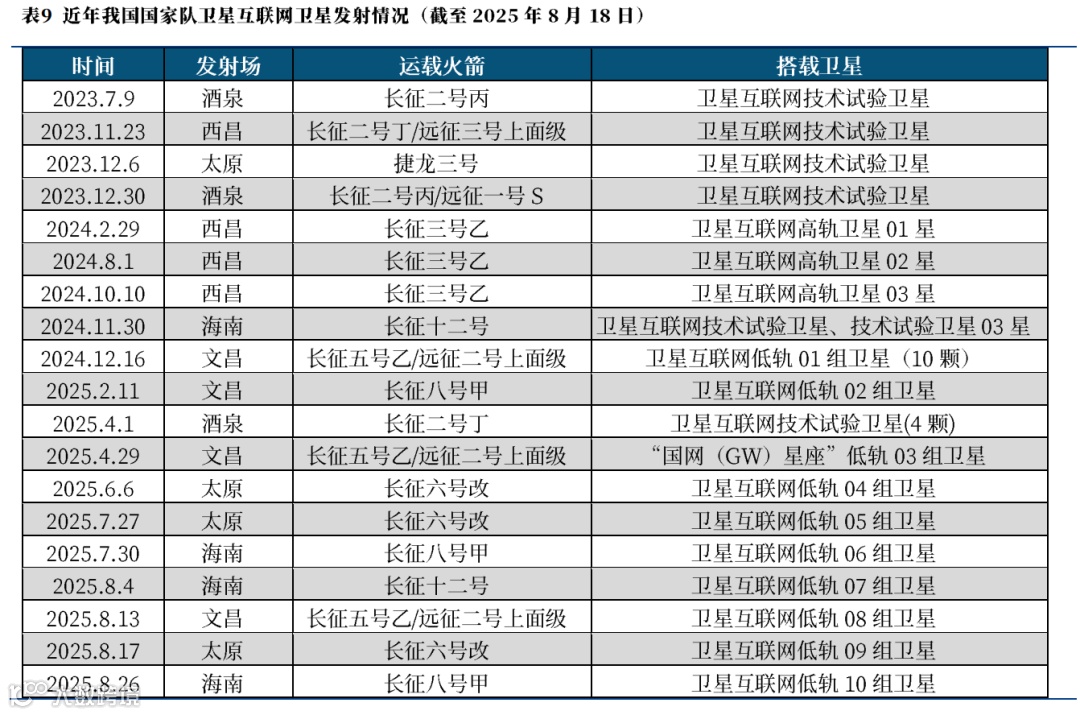 2024年以来我国“国网星座”已展开批量组网发射,截止2025年8月底已成功发射3颗高轨、10组低轨组网卫星。此外,商业组网卫星“千帆星座”也已实现了5次一箭18星的发射,卫星发射总数量达到了90颗。我国卫星互联网正式建设进程已拉开大幕。