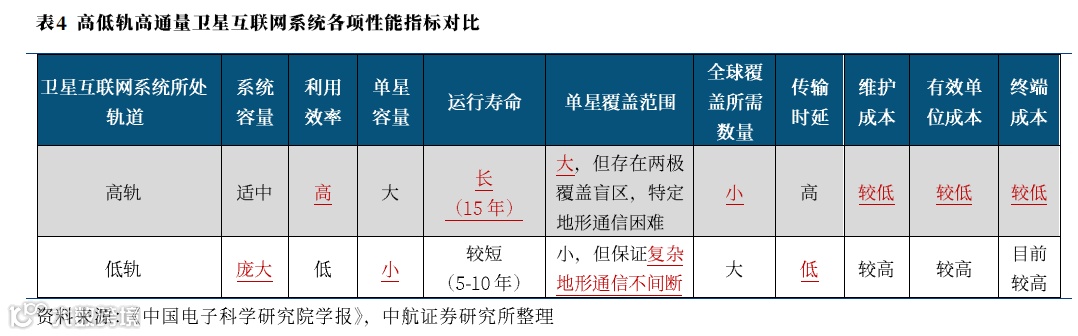 以高轨卫星互联网和低轨卫星互联网为例,不考虑卫星发射,高轨卫星互联网与低轨卫星互联网的性能与成本特点如下: