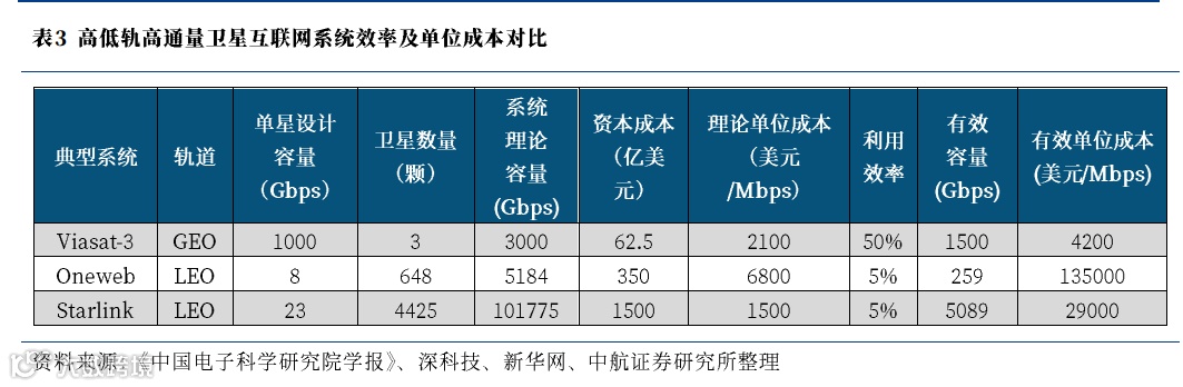 ① 成本方面,高轨卫星互联网系统投入成本方面具有优势。从高低轨高通量卫星互联网系统容量及单位成本对比(见下表)可以看出,由于高轨高通量卫星互联网系统单行设计容量大,可以针对服务地区需求定制容量,因此利用效率高,且卫星数量较少可以降低地面关口站数量。综合来看,高轨卫星互联网所需总体资本投入更小,较低轨高通量卫星互联网系统的有效单位成本也可以做到更低。考虑到高轨卫星寿命一般在15年左右,而低轨卫星寿命一般在5-10年,高轨卫星互联网在投入成本方面将较低轨卫星互联网更具有显著性优势。