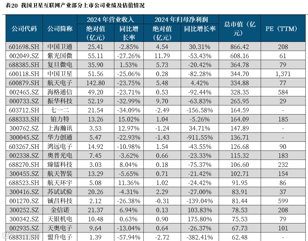 但另一方面,2025年6月18日,证监会发布《关于在科创板设置科创成长层增强制度包容性适应性的意见》,以设置科创成长层为抓手,重启未盈利企业适用科创板第五套标准上市并扩大适用范围,支持人工智能、商业航天、低空经济等更多前沿科技领域企业上市。以商业航天产业领域的火箭总体企业蓝箭航天为例,其近两年虽然仍处于亏损状态,但凭借液氧甲烷火箭技术突破和较高的估值水平,成为新政后首批冲刺IPO的标杆企业。2025年7月29日,蓝箭航天在北京证监局办理辅导备案登记,拟首次公开发行股票并在科创板上市。此外,2025年8月1日,屹信航天在江苏证监局完成了首次公开发行股票辅导备案,2025年8月12日,中科宇航在广东证监局进行IPO辅导备案。我们认为在证监会新政制度包容性改革与风险管控创新的驱动下,我国卫星互联网企业有望迎来新一轮的上市潮,尤其是行业下游的卫星总装和运营型企业,有望率先开辟上市道路。