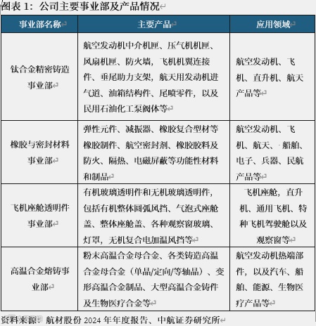 公司是中国航发集团下属航空材料的龙头上市公司,主要从事航空航天用部件及材料研发、生产和销售,下设钛合金精密铸造事业部、橡胶与密封材料事业部、飞机座舱透明件事业部、高温合金熔铸事业部,主要应用于航空航天领域,同时广泛应用于船舶、兵器、电子、核工业、铁路、桥梁、化工、汽车、生物工程等领域。
