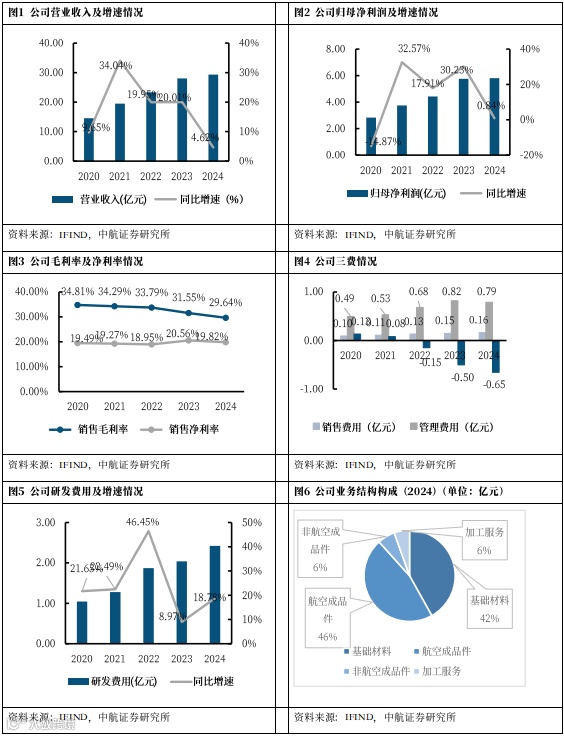 2024年公司营业收入(29.32亿元,+4.62%),公司产品结构发生变化,航空成品件、非航空成品件和加工服务收入增长,基础材料收入同比减少。归母净利润(5.81亿元,+0.84%),增长幅度放缓明显主要系本期公司产品结构变化、综合毛利率下降,同时公司持续增加研发投入,研发费用同比增长18.78%所致。扣非归母净利润(5.14亿元,-9.26%),主要为公司持有交易性金融资产对当期利润影响为0.59亿元。公司综合毛利率(29.64%,-1.91pcts),净利率(19.82%,-0.74pcts),公司产品结构变化,毛利率较高的业务收入占比降低;同时,由于财务费用及投资净收益增加,净利率降幅缩窄。