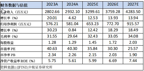 基于以上观点,我们预计公司2025-2027年的营业收入分别为33.00亿元、37.59亿元和42.84亿元,归母净利润分别为6.53亿元、7.73亿元及9.16亿元,EPS分别为1.45元、1.72元、2.03元。基于公司所处行业地位以及未来的发展前景,我们给予“买入”评级,目标价64元,目标价格对应2025-2027年PE分别为44倍、37倍、32倍。