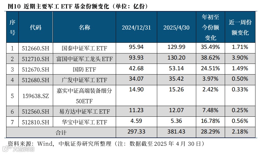 从交易层面来看,3月底以来14个交易日内(截至4月18日),主要军工ETF基金份额增加12.25%(4月7日当天增加2.22%),年初至今已增长26.12%,充分体现出市场环境波动下,市场对于军工板块发展依旧充满信心;